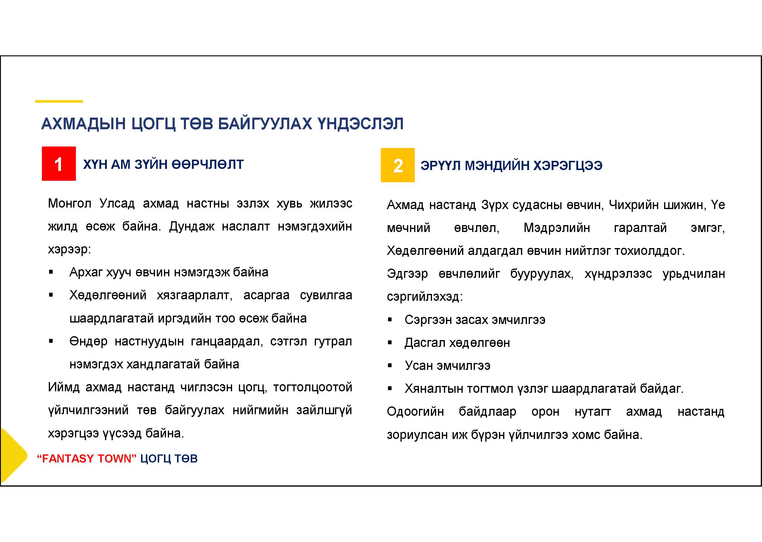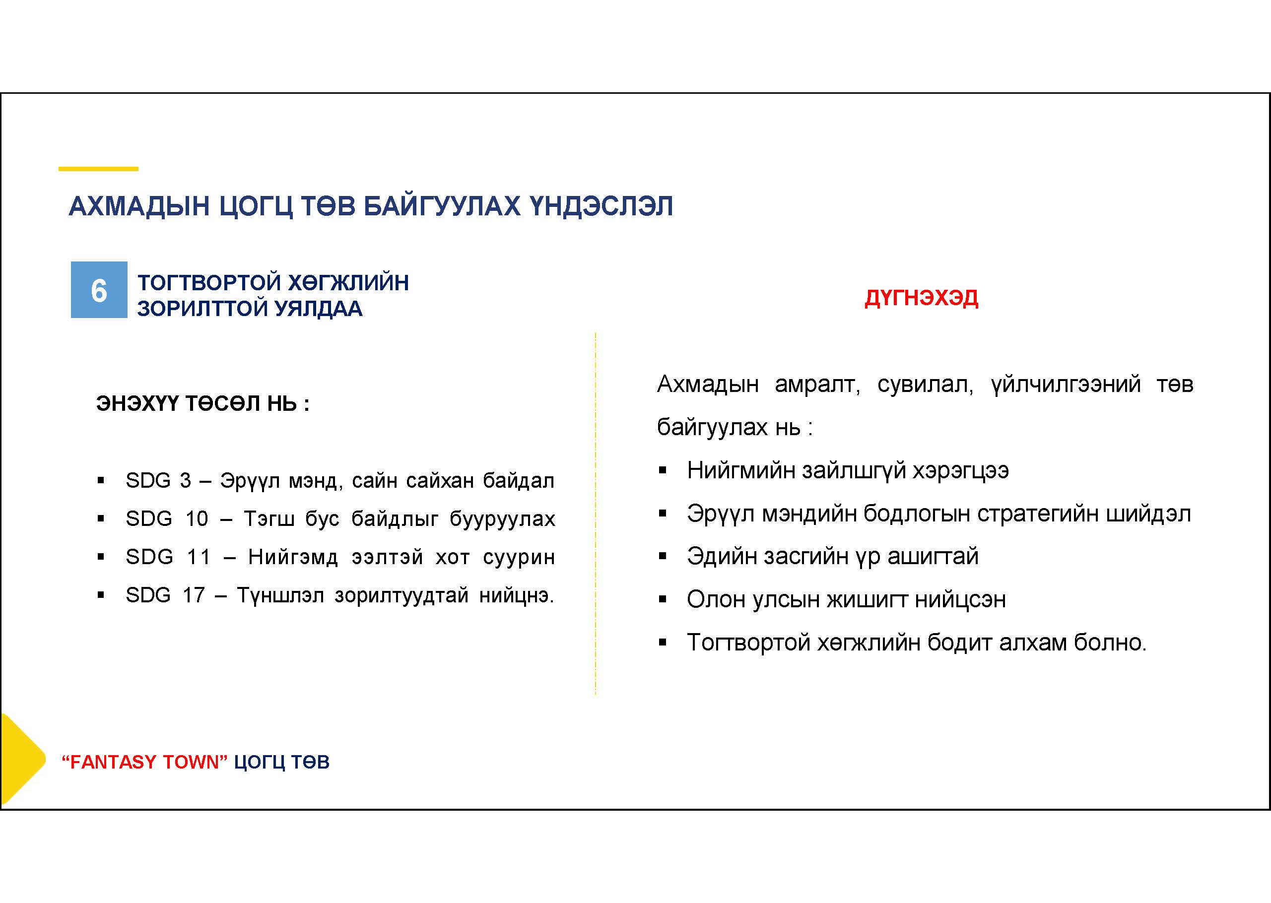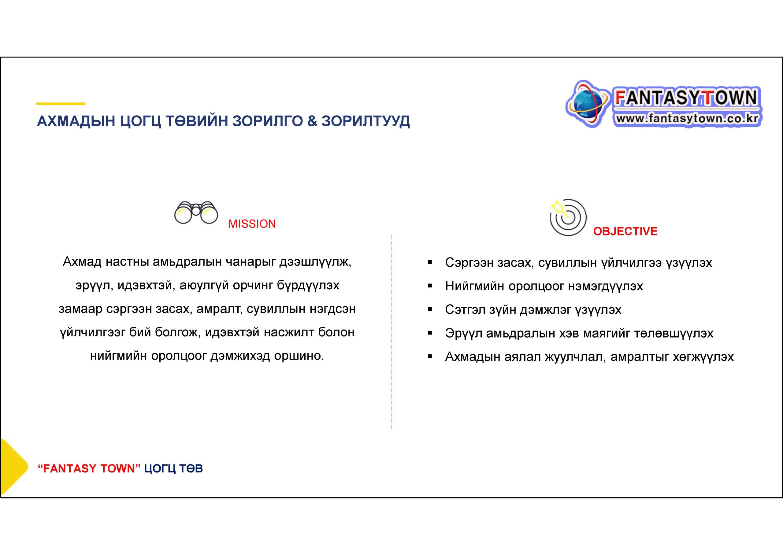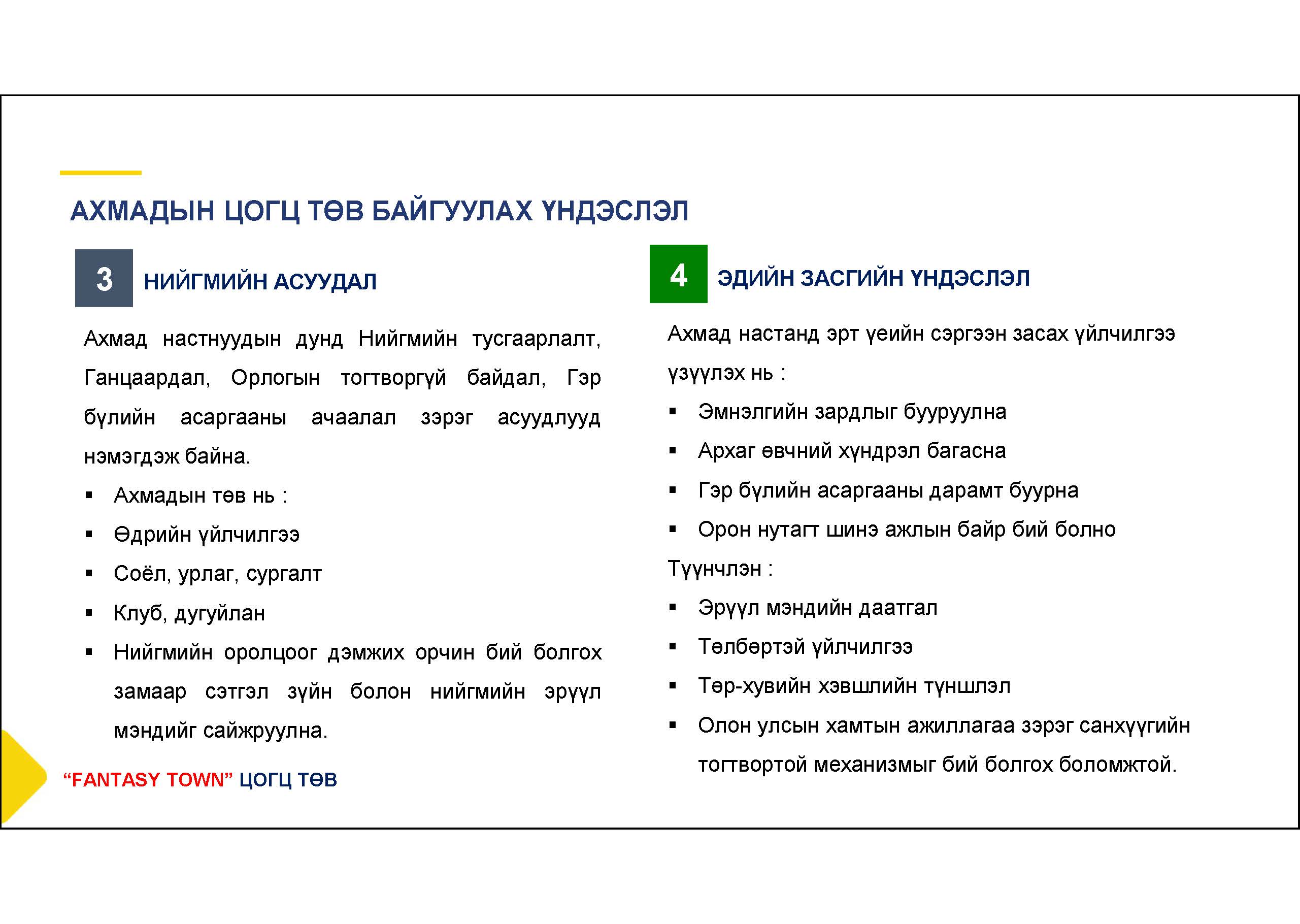 АХМАДЫН АМРАЛТ, СУВИЛАЛ, ҮЙЛЧИЛГЭЭНИЙ “FANTASY TOWN” ЦОГЦ ТӨВ