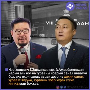 Ерөнхий сайд Г.Занданшатар: МАН-ын дарга ёс зүйтэй байх ёстой. Би баялгийн ямар ч хулгайтай холбогдоогүй. Миний орлого, зарлага тодорхой. Би ном уншиж явснаас өөр юмтай холбогдож явсангүй. Би ахмадууд, залуучууд аль алинтай нь уулзсан. Тэд Засгийн газар тогтвортой байхыг хүсэж байна. МАН-ын даргын ёс зүйн босго намсах ёсгүй. МАН-ын дарга болвол намаа эрс шинэчилнэ. Цэвэр болгоно.