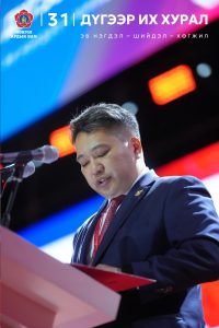 Ийм ч учраас та бид өнөөдөр бид намынхаа ирээдүйн ялалтын төлөө Монгол Улсынхаа ирээдүйд хүлээж буй түүхэн хариуцлагын өмнө хамтдаа хуран цуглараад бна. Энэ бол таны, миний, бидний хамтын үүрэг. Энэ бол хамтын тангараг юм.