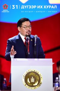 Монголын өнцөг булан бүрээс ирсэн эрхэм хүндэт төлөөлөгч та бүхний хэлэлцэж буй асуудал, гаргасан шийдвэрийг монголчууд чих тавин хүлээж, дэлхийн улс орнууд анхааралтай ажиглаж буйг онцлохыг хүсэж байна. Тиймээс Монгол Ардын намын 31 дүгээр Их хурал тавьсан зорилтоо амжилттай хэрэгжүүлж, улс эх орныхоо хөгжил дэвшил, хүн ардынхаа сайн сайхны төлөө бодит хувь нэмэр оруулна гэдэгт Монгол Улсын Ерөнхийлөгчийн хувьд итгэл дүүрэн байна. Цаашид төр засгийн бодлогод шударга ёсыг эрхэмлэж, улс орны бүтээн байгуулалтыг эрчимжүүлж, байгалийн баялгийн үр өгөөжийг тэгш, шударга хүртээхэд чиглэх учиртай. Үүнд улс төрийн ууган хүчин Монгол Ардын нам онцгой анхаарч, манлайлан ажиллах ёстой.