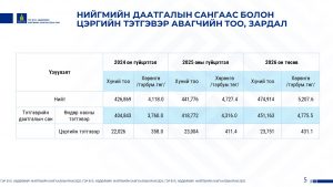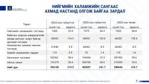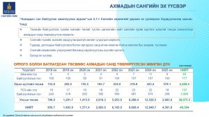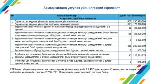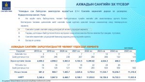Орлого болон батлагдсан төсвөөс ахмадын санд төвлөрүүлсэн мөнгөн дүнг 8 жилийн дүнгээр танилцуулж эх үүсвэрүүдийг тайлбарлалаа.Мөн ахмадын сангийн зарцуулалтыг 8 жилийн үзүүлэлтээр харууллаа.