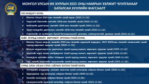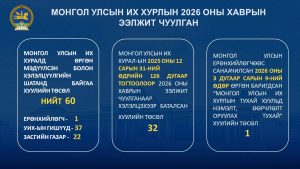 УИХ-ын энэ хаврын чуулганаар нийт 60 төсөл хэлэлцэхээр төлөвлөсөн бөгөөд нэг нь Ерөнхийлөгчийн санаачлан боловсруулсан Монгол Улсын Их Хурлын тухай хуульд нэмэлт, өөрчлөлт оруулах тухай хуулийн төсөл гэдгийг УИХ-ын гишүүн Н.Батсүмбэрэл танилцууллаа.