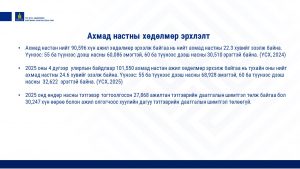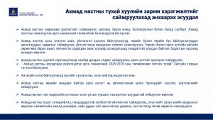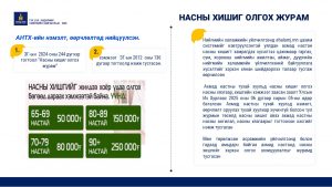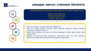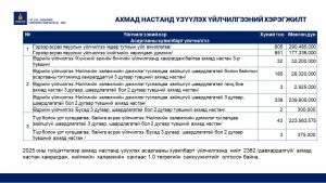 Ахмадуудын хөдөлмөр эрхлэлтийг дэмжих, тэтгэврийн хэмжээг өмнөх оны инфляцын жилийн дундаж түвшинтэй уялдуулж жил бүрийн нэгдүгээр сарын нэгнээс нэмэгдүүлэх, халамжийн сангаас ахмад настанд олгож буй санхүүжилт, хөнгөлөлт, тусламж, насны хишиг, асаргааны тэтгэмж зэрэг төрийн бодлого хэрэгжиж буйг тайлбарлалаа. Эдгээрээс амралт, рашаан сувиллын хөнгөлөлтөд ахмадууд хамгийн өндөр хувиар хамрагддаг бөгөөд энэ жил 52 амралт, сувиллын газартай хамтран ажиллахаар гэрээ байгуулсан байна.